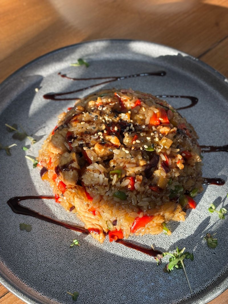 Фунчоза с курицей Перец светофор, фунчоза, красный лук, сочная морковь, нежная курица, соевый соус. 1990 ₸