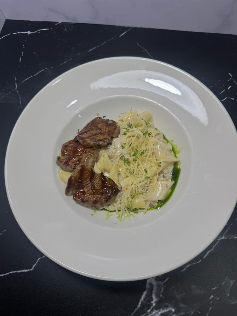 Стейк паста в сливочно-грибном соусе Паста, бонфиле из мраморной говядины, турецкий соус, сыр пармезан и страчателла 2990 ₸