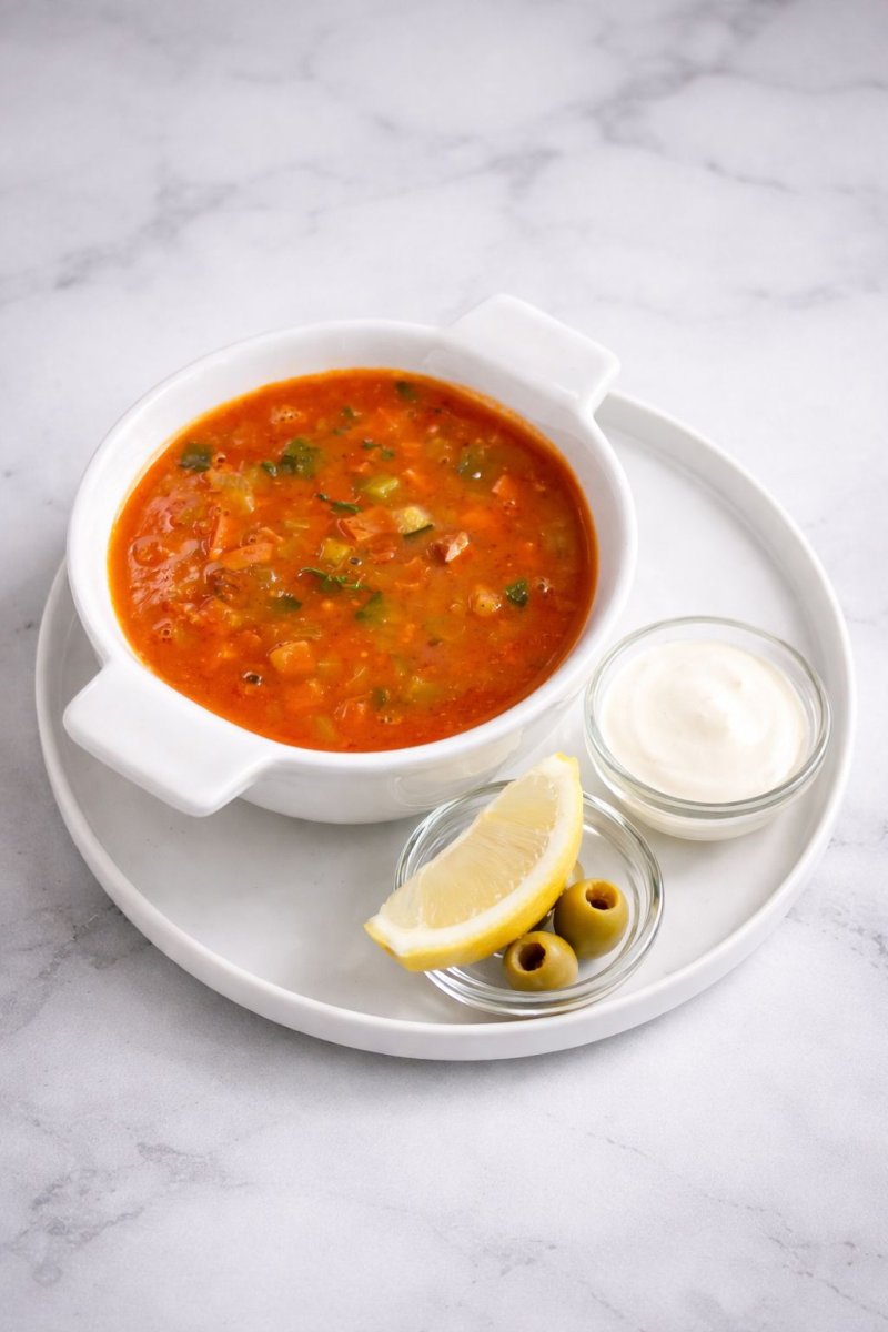 Солянка Сбор мяса (говядина, солённые огурцы, сосиски, охотничьи колбаски, маслины оливки) подается с домашней сметаной и долками лимона 1690 ₸