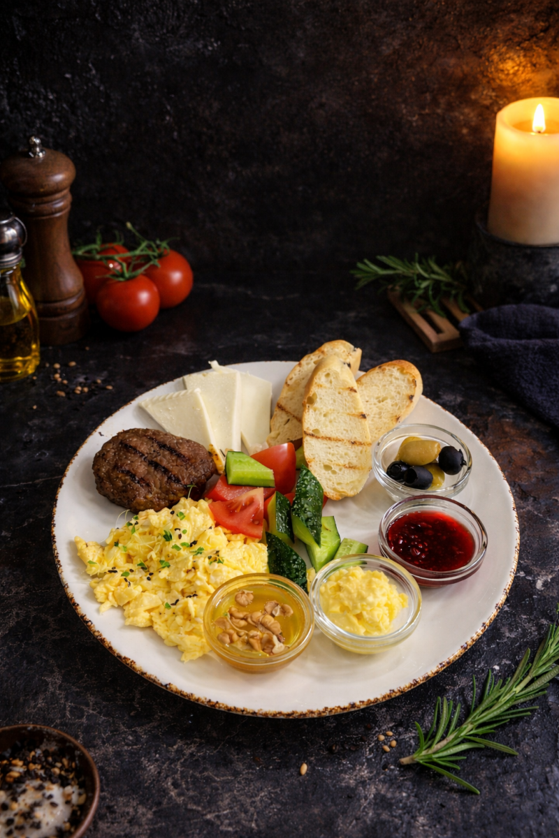 Турецкий завтрак Если кто-то говорит что не любит завтракать, вероятно он просто не пробовал разнообразный завтрак как в Турции. (вкусный сыр, свежие овощи, оливки, маслины, мед, каттама нан, скрэмбл) грецкий орехи, брынза 2090 ₸