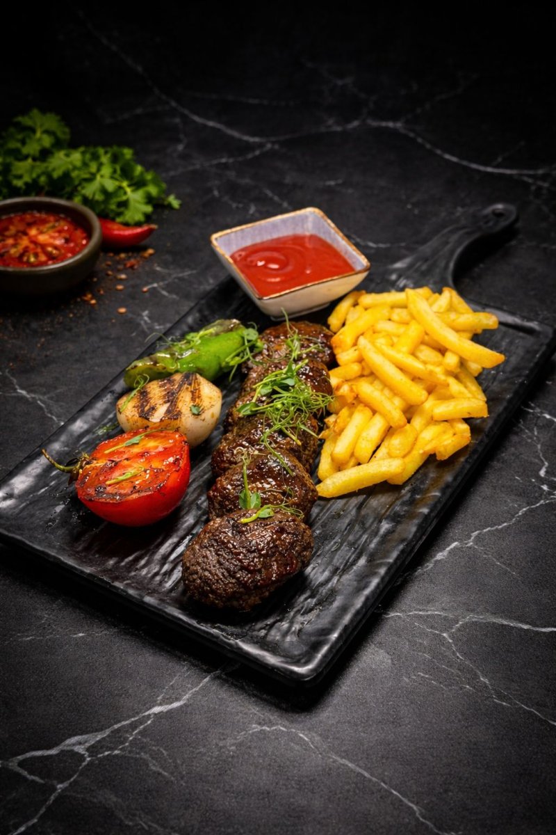Касап кофте с фри Турецкие мясные котлетки, салат турецкий, соус турецкий, подается с картофелем фри. 2890 ₸