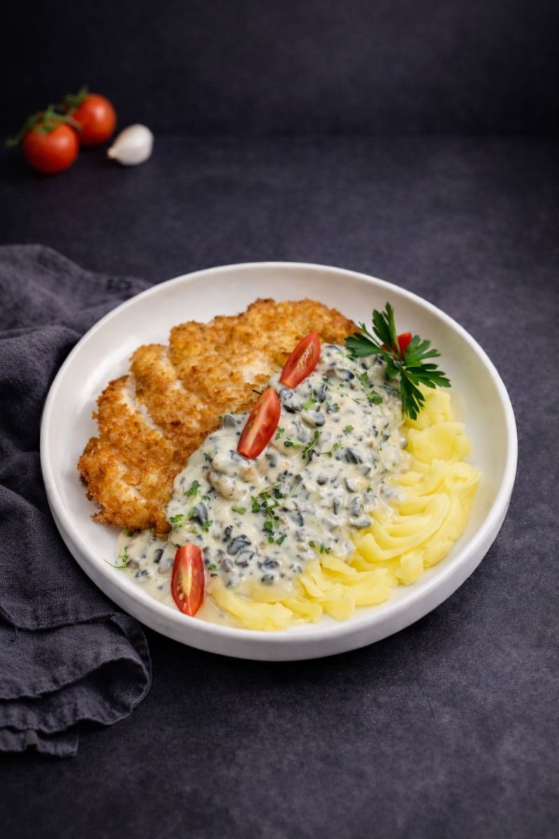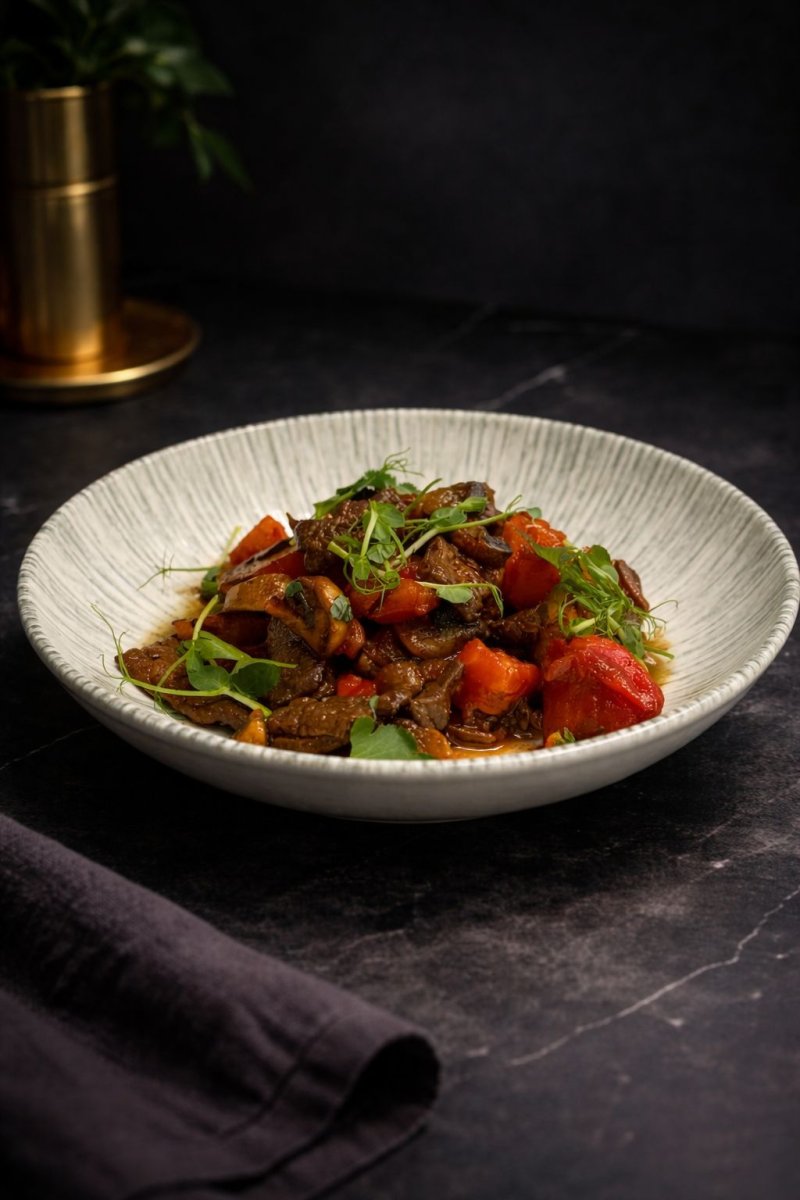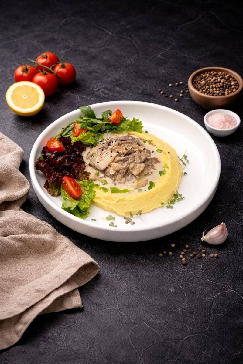 Бефстроганов с пюре Бонфиле из говядины, трюфельное масло шампиньоны в соусе бешамель, с воздушным пюре. 3790 ₸