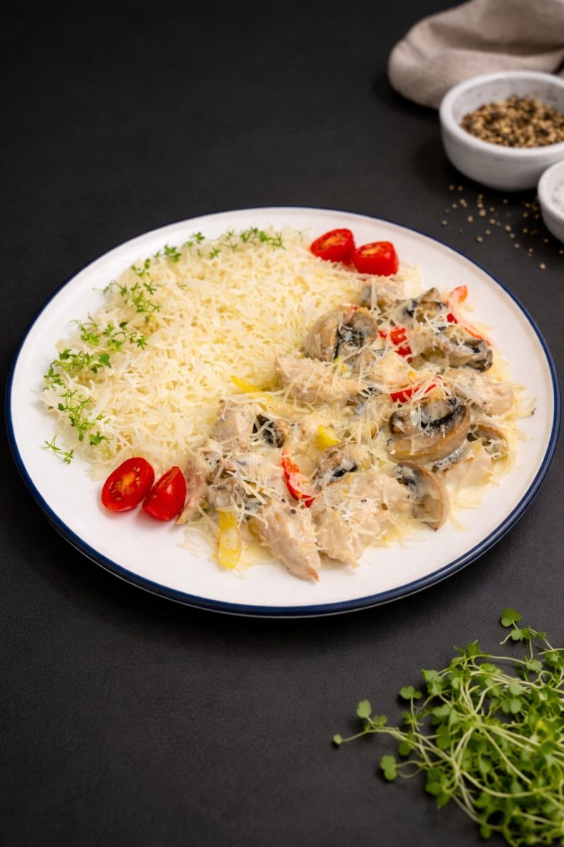 Курица с грибами Нежное куриное филе, с шампиньонами, посыпанное домашним сыром моцарелла, будет таять у вас во рту! 2690 ₸