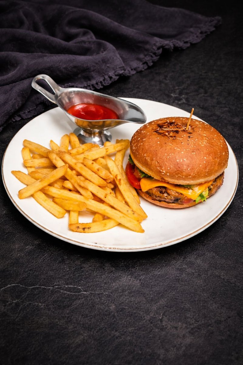 Бургер с телятиной Котлета из мраморной говядины свежая булочка бриошь, с сырным соусом, лист сочного салата, маринованные огурцы, томаты отборные, красный лук подается с картофелем фри и кетчупом. 2190 ₸